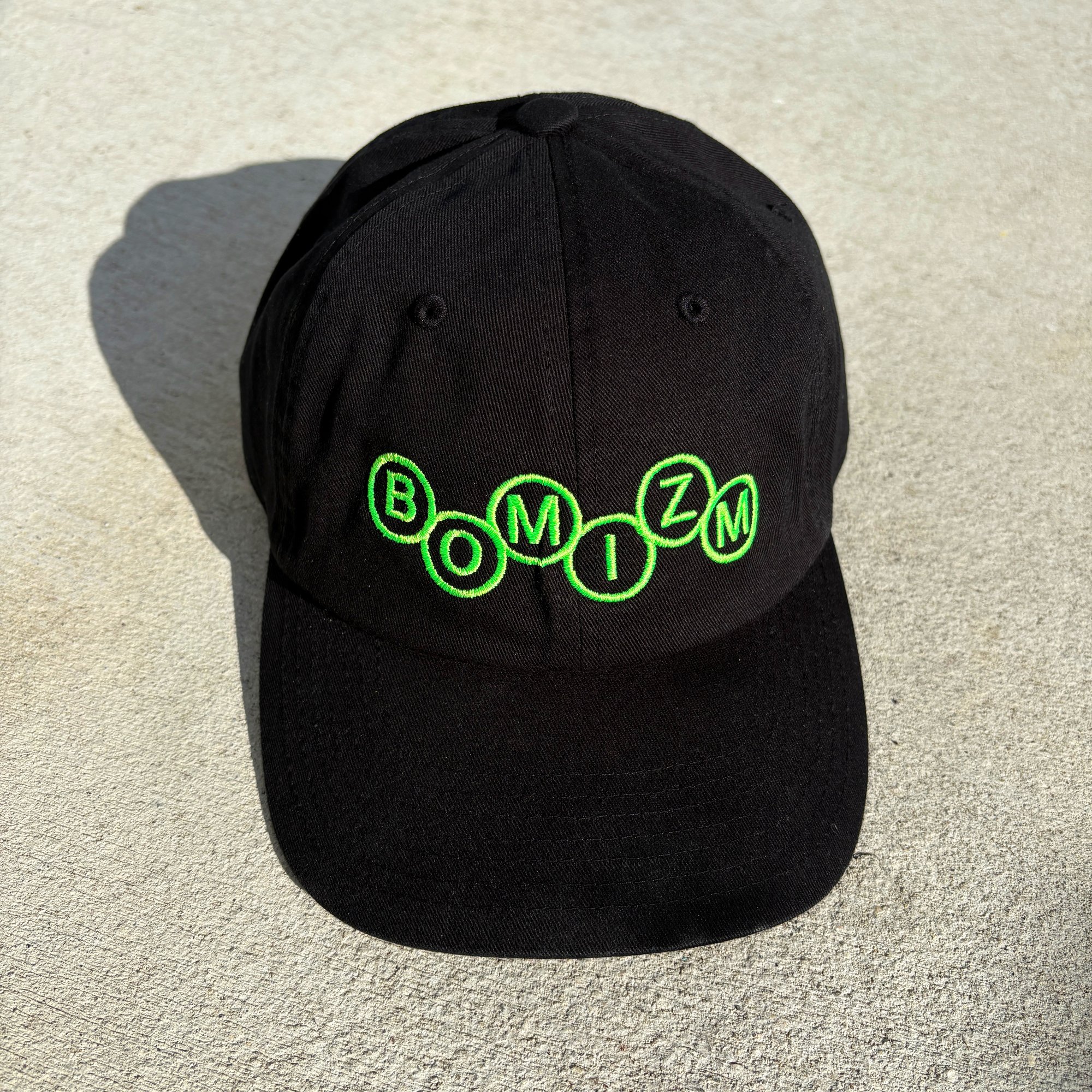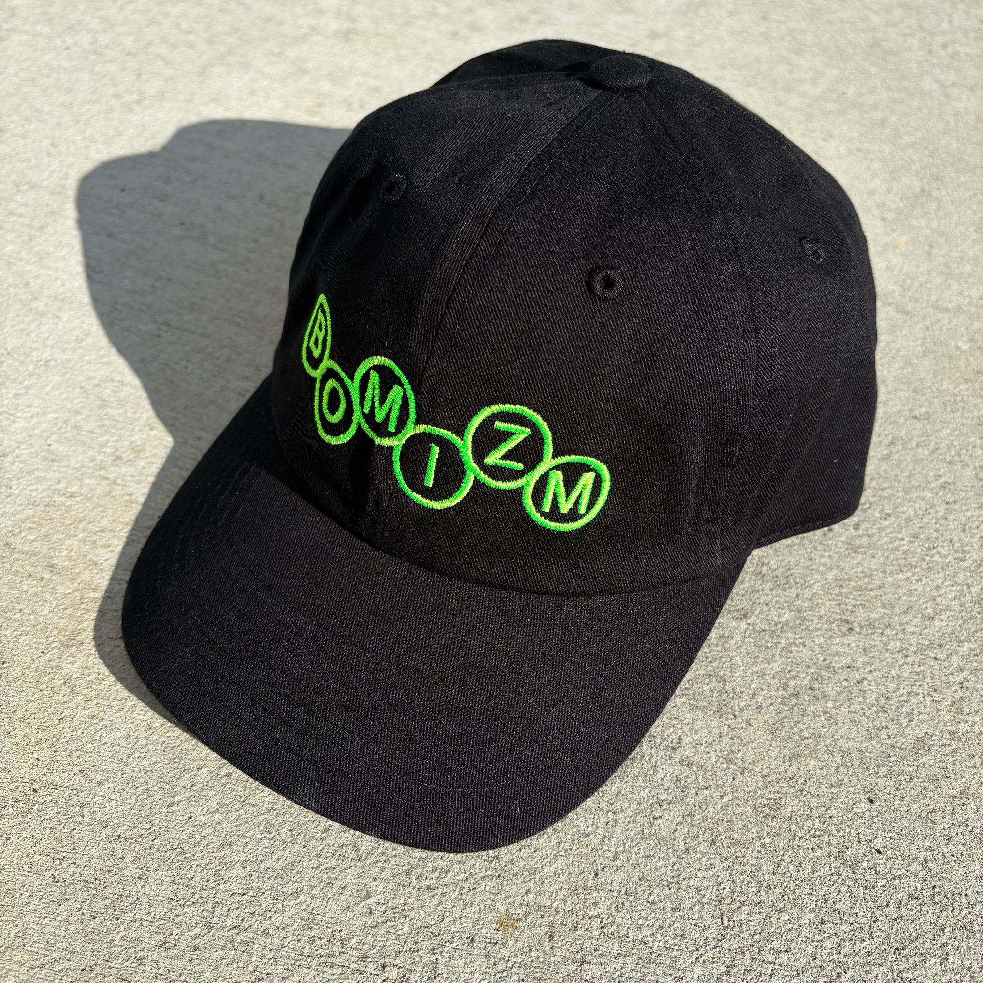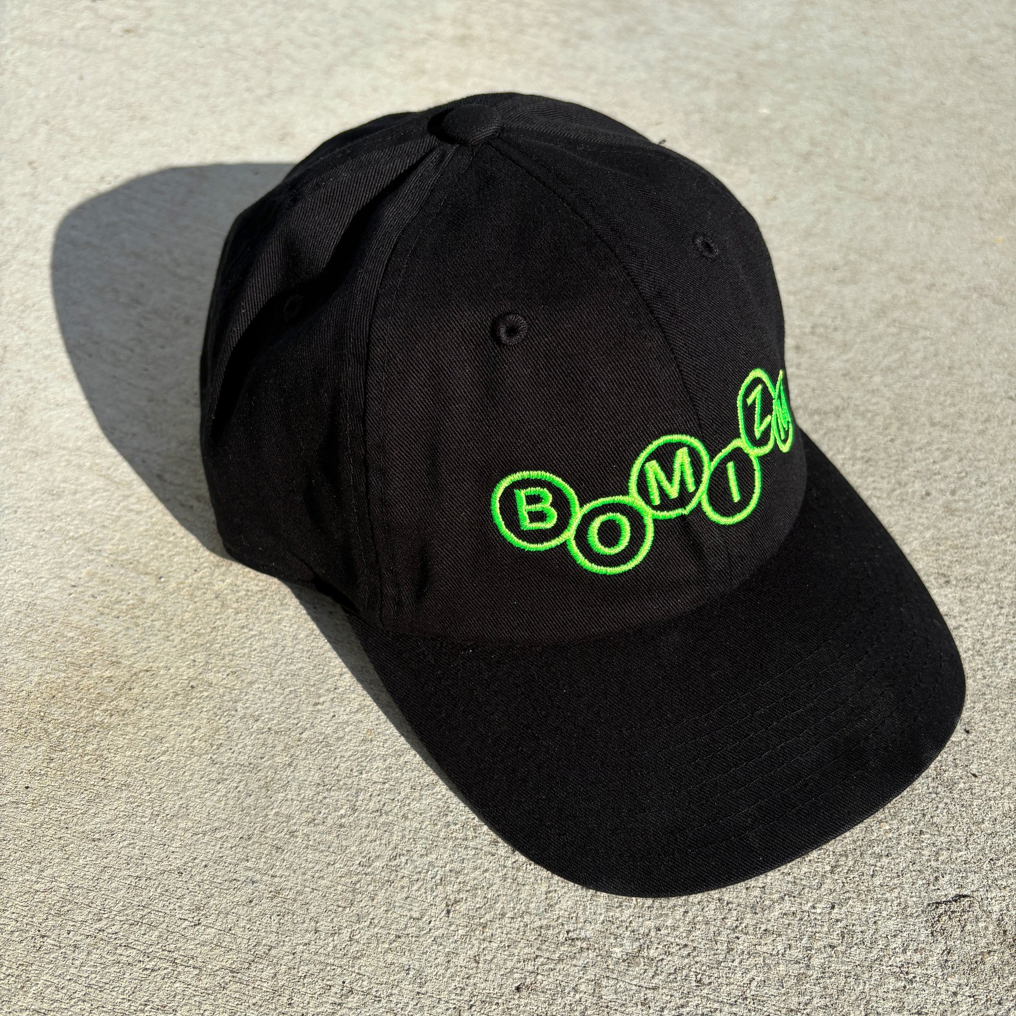 Black adjustable strap-back hat with neon green embroidery.